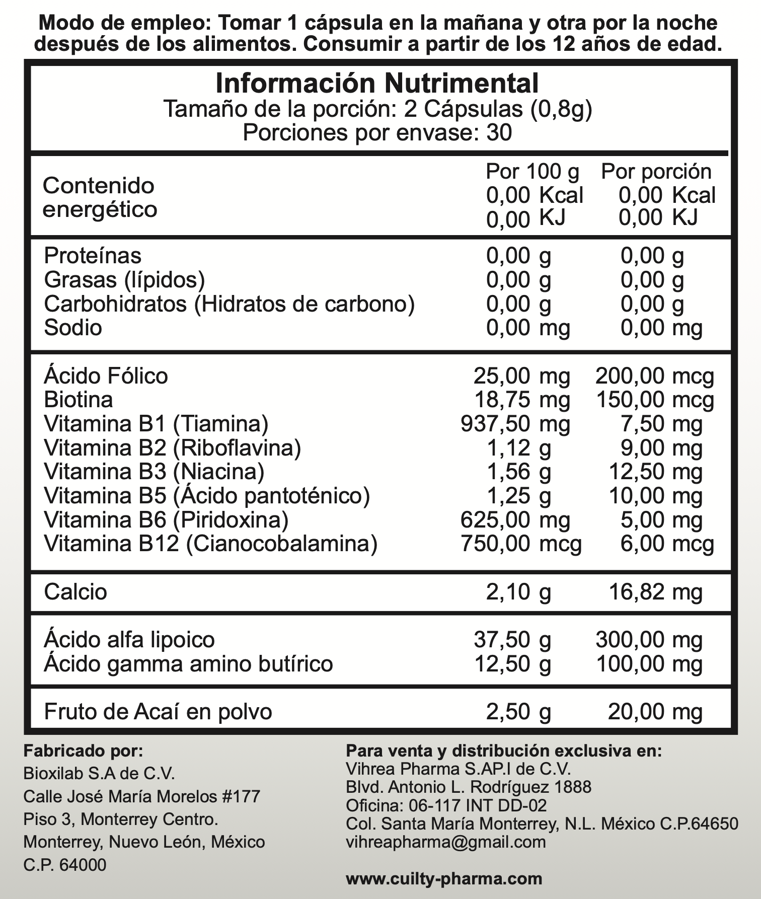 Contiene GABA, Acido Alfa Lipoico, Acaí y Complejo B.